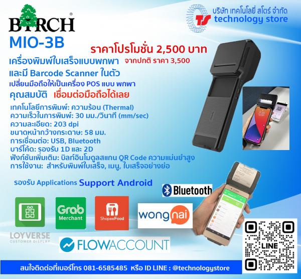 Birch MiO-3B คืออุปกรณ์พกพาแบบ Combo '2-in-1' ที่ออกแบบมาเพื่อเปลี่ยนสมาร์ทโฟนหรือแท็บเล็ตให้กลายเป็นเครื่อง POS เคลื่อนที่ โดยรวมเอาเครื่องพิมพ์ใบเสร็จ เครื่องสแกนบาร์โค้ด